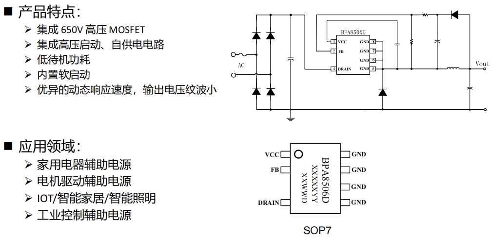 BPA8506D是一款集成了650V高壓MOSFET的高性能電源管理芯片,專為滿足家用電器、電機驅動、物聯(lián)網設備以及工業(yè)控制等領域的輔助電源需求而設計。它不僅具備高壓啟動和自供電功能,還實現(xiàn)了低待機功耗、優(yōu)異的動態(tài)響應速度以及低輸出電壓紋波等特性,極大地提升了電源系統(tǒng)的整體性能。
