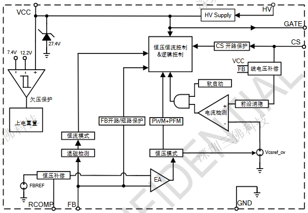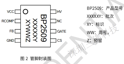 ?BP2509芯片定位?:一款高性能電流模式PWM控制器,支持寬輸入電壓(8V-450V),內(nèi)置高壓啟動(dòng)電路,適用于Buck、Buck-Boost等非隔離拓?fù)?。?nèi)部框架圖如下所示