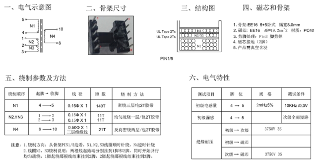 變壓器作為電源適配器中的關(guān)鍵部件,其性能直接影響電源轉(zhuǎn)換效率與輸出穩(wěn)定性。該適配器采用 EE16 型號的變壓器,初級與次級繞組匝數(shù)比為 140:21,電感量設(shè)定為 2mH,磁芯有效截面積為 19.2mm2。
