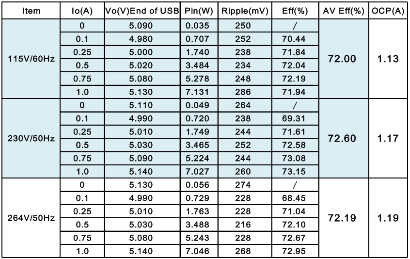 效率是衡量充電器性能的重要指標(biāo)之一。根據(jù)測試數(shù)據(jù),在不同輸入電壓和負(fù)載條件下,該充電器的效率表現(xiàn)較為出色。例如,在輸入電壓為 115Vac/60Hz 時,滿載效率達(dá)到 72.00%;而在輸入電壓為 230Vac/50Hz 時,滿載效率為 72.60%。這表明充電器在不同工作條件下都能保持較高的轉(zhuǎn)換效率,減少了能量損耗,提高了能源利用率。