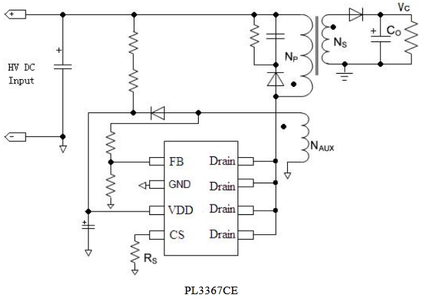 PL3367CE具有低啟動電流,可以采用大的啟動電阻以及小的VDD電容以降低應(yīng)用中的功率損耗。其工作電流很低,再加上特有的復合模式控制,從而提高了系統(tǒng)的效率,特別是系統(tǒng)處于輕載條件下。