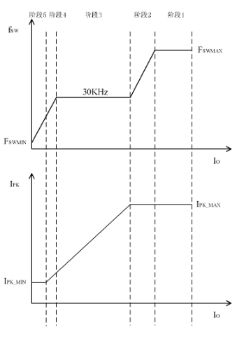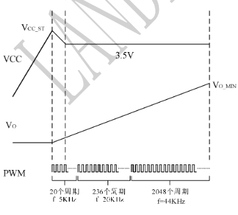 通過啟動(dòng)電路給VCC電容充電,VCC達(dá)到啟動(dòng)電壓VCC_ST,芯片輸出PWM開關(guān)信號。此時(shí)輸出電壓開始上升,因輸出電壓還小,VCC電壓會下降到3.5V,VCC通過自供電維持在3.5V。PWM開關(guān)信號經(jīng)過以下3個(gè)階段,軟啟動(dòng)結(jié)束。軟啟動(dòng)結(jié)束時(shí),輸出電壓上升到VO_MIN:若VO_MIN>3.5V,芯片正常工作;若VO_MIN<3.5V,芯片輸出短路保護(hù)。
