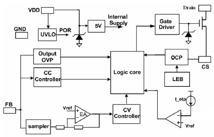 恒流/恒壓控制階段:芯片通過FB腳檢測輔助繞組的電壓,進而間接采樣輸出電壓。在恒壓工作模式下,內(nèi)部誤差放大器對采樣電壓進行調(diào)節(jié),使輸出電壓保持恒定。在恒流工作模式下,芯片通過CS腳檢測原邊電感電流,保持輸出電流恒定。當(dāng)負(fù)載變化時,芯片能夠自動調(diào)整開關(guān)頻率和占空比,確保輸出電壓和電流的穩(wěn)定性。