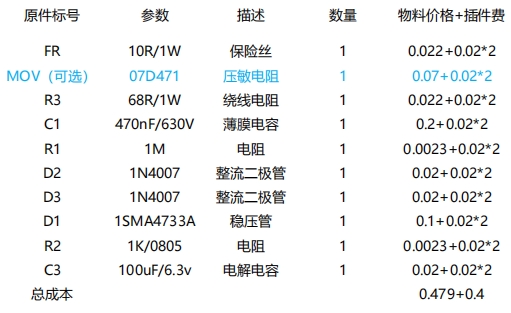 從 BOM 方案及成本來看,YD925 方案的物料種類大幅減少,且大多為貼片元件,尺寸小,可實現(xiàn)全貼片加工,極大地降低了生產(chǎn)成本和體積。以一個典型的 5V 輸出供電方案為例,YD925 的外圍電路簡潔明了,主要包括壓敏電阻(可選)、整流二極管、電解電容等常見元件,總成本(不包含芯片)僅為 0.202 元,相比傳統(tǒng)阻容降壓方案的 0.479+0.4 元,成本優(yōu)勢不言而喻。