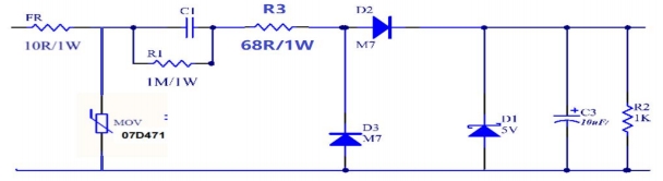 原理圖(如下所示,AC源通過C1電容的交流阻抗限流,經(jīng)半波整流和穩(wěn)壓管穩(wěn)壓濾波后輸出)