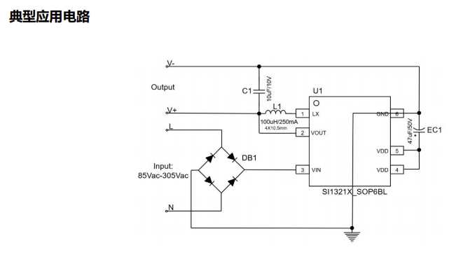 SI1321X系列芯片設(shè)計注重緊湊性與易用性,兼容CD32/43貼片電感和0410色環(huán)電感,無需額外的π型濾波或安規(guī)電容即可滿足EMI標(biāo)準(zhǔn),大大簡化了電路設(shè)計。此外,輸入端免去了高壓電解電容的使用,進(jìn)一步降低了成本和體積,使得該芯片在空間受限的應(yīng)用場景中更具優(yōu)勢。