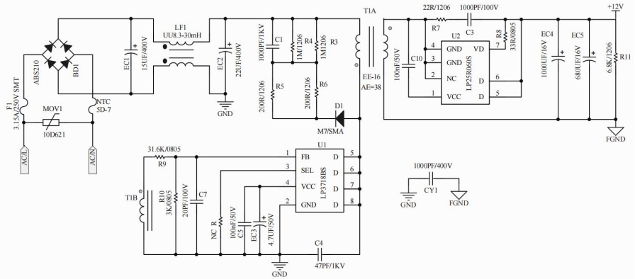 LP3718BS是一款高性能的PWM控制器,具備多種保護(hù)功能和調(diào)制方式。在本方案中,LP3718BS負(fù)責(zé)控制開關(guān)頻率、占空比以及實(shí)現(xiàn)過流保護(hù)、短路保護(hù)等功能。通過精確的控制算法,LP3718BS能夠確保電源在不同負(fù)載條件下的穩(wěn)定輸出。電路圖如下所示~