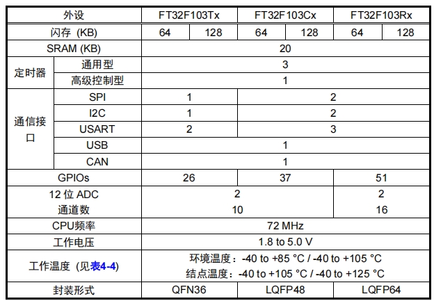 FT32F103x8/B 微控制器集成了高性能的 Arm? Cortex?-M3 32 位 RISC 內(nèi)核,工作頻率為 72 MHz,內(nèi)嵌高速存儲器 (高達 128 KB 的閃存和 20 KB 的 SRAM),以及大量的增強型 I/O 和連接到兩條 APB總線的外設(shè)。所有器件都提供兩個 12 位 ADC、三個通用 16 位定時器和一個 PWM 定時器,以及標(biāo)準(zhǔn)和先進的通信接口:多達兩個 I2C、兩個 SPI、 三個 USART、一個 USB 和一個 CAN。