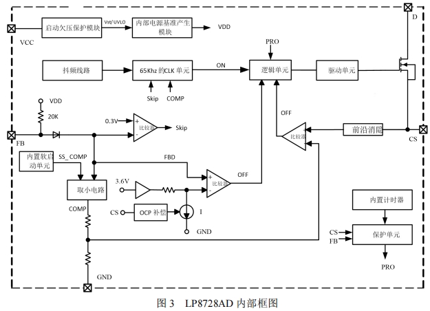 保護(hù)單元:包括VCC過壓保護(hù)、CS電阻短路保護(hù)、輸出過載保護(hù)等多種保護(hù)功能,確保系統(tǒng)在異常工況下的安全運(yùn)行。