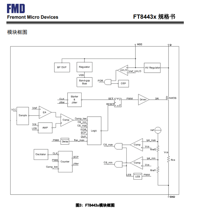 FT8443x采用超高壓工藝,內(nèi)部集成高壓啟動電路,高壓功率開關(guān),以及電流采樣電阻,減少了外部元器件,極大地簡化了系統(tǒng)應(yīng)用。內(nèi)置的頻率抖動和軟驅(qū)動設(shè)計能有效提高EMI性能。