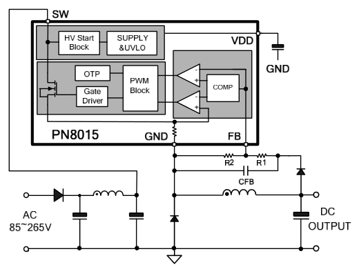 寬輸出范圍非隔離開關電源芯片—PN8015;產品特征:內置800V高雪崩能力智能功率MOSFET、高壓啟動和自供電電路、適用于Buck、Buck-Boost、Flyback等多種架構、輸出電壓3。3V-12V可通過FB電阻調整、半封閉式穩(wěn)態(tài)輸出電流>200mA@230VAC、改善EMI的降頻調制技術、優(yōu)異的負載高速率和工作效率、全面的保護功能。開關電源芯片—PN8015應用于:非隔離輔助電源、家電、智能家居等領域。