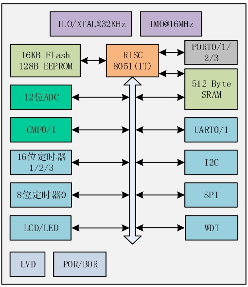 采用1T 8051內(nèi)核,時鐘頻率最高可達33MHz,同時具備低功耗模式,動態(tài)功耗低至0.18mA/MHz。