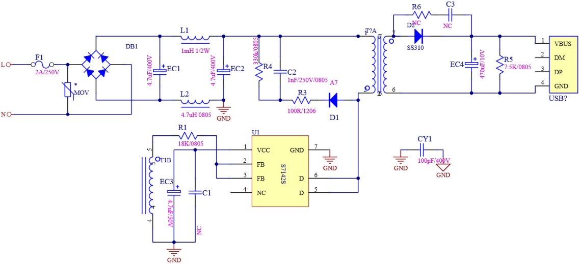 S7142S的參考設(shè)計采用了先進的電路架構(gòu),確保了電源的高效轉(zhuǎn)換和穩(wěn)定輸出。芯片內(nèi)部集成了多種保護功能,如過壓保護、欠壓保護、過流保護等,這些功能不僅提高了電源的安全性,還延長了設(shè)備的使用壽命。此外,S7142S還具備低待機功耗的特性,其空載待機功耗小于100mW,這使得它在節(jié)能方面表現(xiàn)出色,符合現(xiàn)代電子設(shè)備對環(huán)保和能效的要求。