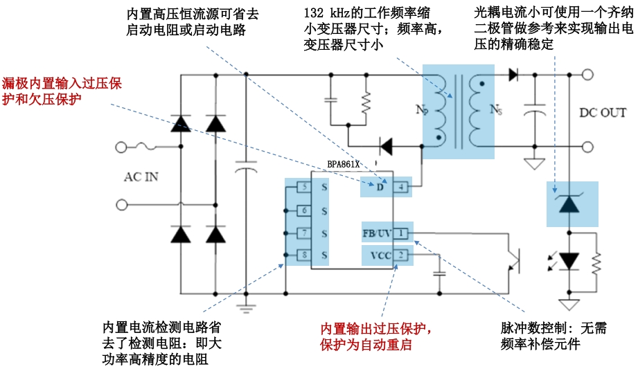 在設(shè)計細節(jié)上,BPA861X 也展現(xiàn)出了諸多優(yōu)化之處。它內(nèi)置了高壓恒流源,可以省去啟動電阻或啟動電路,簡化了外圍電路設(shè)計,降低了成本。同時,BPA861X 還內(nèi)置了電流檢測電路,省去了檢測電阻,這不僅減少了外圍元件數(shù)量,還提高了檢測精度和可靠性。相比之下,友商產(chǎn)品在這些方面往往需要額外的外圍元件來實現(xiàn)相同的功能,這不僅增加了設(shè)計復雜度和成本,還可能因元件數(shù)量的增加而降低系統(tǒng)的可靠性。