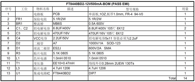 以下是FT8440BD2方案的物料清單,包括了電路板、保險電阻、整流橋、鋁電解電容、貼片電容、二極管、貼片電阻、色環(huán)電感、變壓器、貼片電感和集成電路IC等元件。這些元件均為高品質(zhì)的常用元件,易于采購且成本較低。
