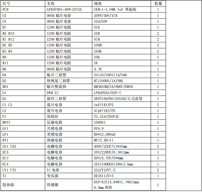 BOM(物料清單)是DEMO樣板的重要組成部分,它詳細列出了所有用于構建電源的元件。LPKSF001的BOM清單包括: