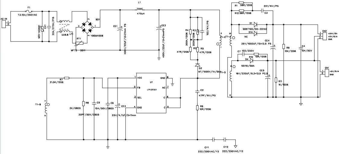 LPKSF001的原理圖是理解其工作原理的關鍵。它采用反激式拓撲結構,通過外置電阻和變壓器匝比來精確控制輸出電流和電壓。原理圖中還包括了輸入濾波電路、整流電路、反饋電路以及保護電路等關鍵部分。通過內(nèi)置的啟動電路和自供電技術,LPKSF001無需外部啟動電阻和輔助繞組VCC供電二極管,從而進一步簡化了外圍設計。