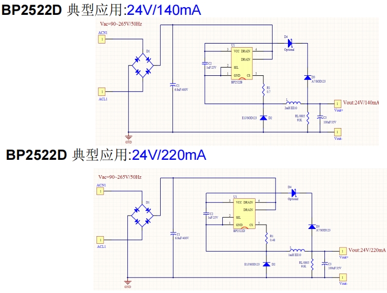 以BP2522D為例,持續(xù)輸出240mA,脈沖350mA,電感量為470uH,電感電流紋波為57mA。最大峰值電流為579mA,BP2522D內部MOS管限制最大電流為750mA,留有一定余量,可取Rcs=0.3ohm。