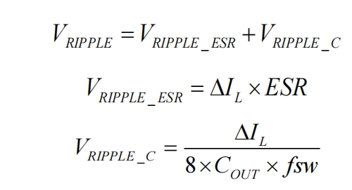 輸出電容的選擇對輸出電壓紋波、系統(tǒng)動態(tài)響應、環(huán)路穩(wěn)定性、輸出電壓過沖等有直接影響。在恒定輸出電流的CV模式下,輸出紋波主要由輸出電容的等效串聯電阻(ESR)和容量決定。紋波計算公式為:
