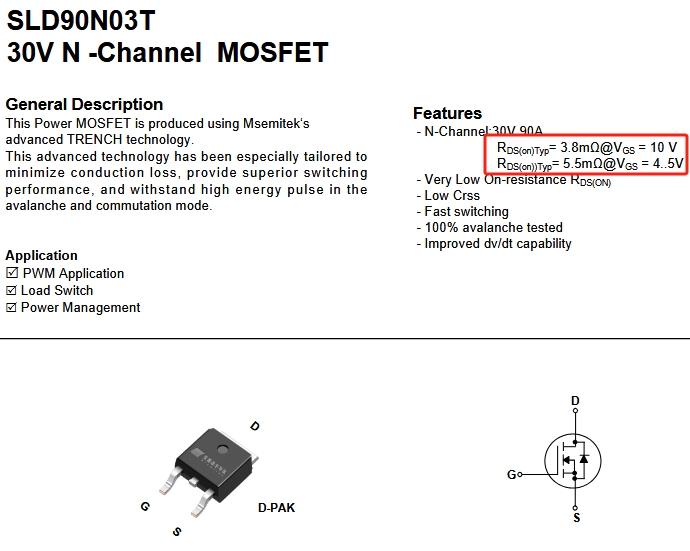 SLD90N03T:基于先進(jìn)溝槽技術(shù)(Trench),優(yōu)化了柵極電荷(Qg)和開關(guān)速度,適合高頻PWM應(yīng)用。