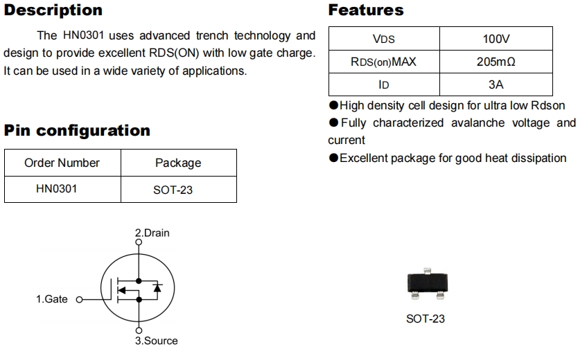 在 60 W 以下的開(kāi)關(guān)電源、馬達(dá)驅(qū)動(dòng)或電池保護(hù)板上,工程師往往希望找到一顆“既耐壓又高開(kāi)關(guān)速度、同時(shí)封裝足夠小”的 MOSFET。華能(HN)推出的 HN0301 把 100 V 耐壓、205 mΩ 低導(dǎo)通電阻和 3 A 連續(xù)電流塞進(jìn)了一顆 SOT-23 三腳小封裝,成為 24 V 工業(yè)母線、12 V/24 V 汽車周邊、POE 受電設(shè)備等場(chǎng)景的新寵。本文結(jié)合原廠數(shù)據(jù)表與實(shí)測(cè)筆記,帶你1分鐘吃透這顆“迷你功率管”。