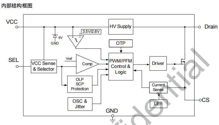 芯片上電后,內(nèi)部500 V高壓恒流源先把VCC沖到3.5 V,啟動完成后高壓源關斷,由輸出電壓經(jīng)電感耦合給VCC續(xù)電,實現(xiàn)“零輔助繞組”反激式供電;同時采樣VCC跌落,一旦低于3.0 V(3.3 V版本)并持續(xù)160 ms,判定輸出過載,進入4 kHz打嗝模式,1.6 s自動重啟。峰值電流比較器僅200 mV閾值,配合250 ns前沿消隱,既能精確限流又不怕DRAIN尖峰誤觸發(fā)。溫度檢測位于MOS柵極區(qū),熱阻155 °C/W,確保芯片在塑料外殼密閉環(huán)境下也能安全降額。