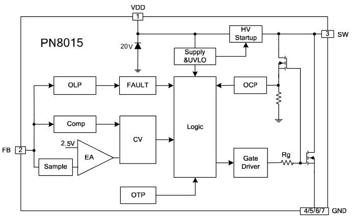 寬輸出范圍非隔離開關電源芯片—PN8015;產品特征:內置800V高雪崩能力智能功率MOSFET、高壓啟動和自供電電路、適用于Buck、Buck-Boost、Flyback等多種架構、輸出電壓3。3V-12V可通過FB電阻調整、半封閉式穩(wěn)態(tài)輸出電流>200mA@230VAC、改善EMI的降頻調制技術、優(yōu)異的負載高速率和工作效率、全面的保護功能。開關電源芯片—PN8015應用于:非隔離輔助電源、家電、智能家居等領域。