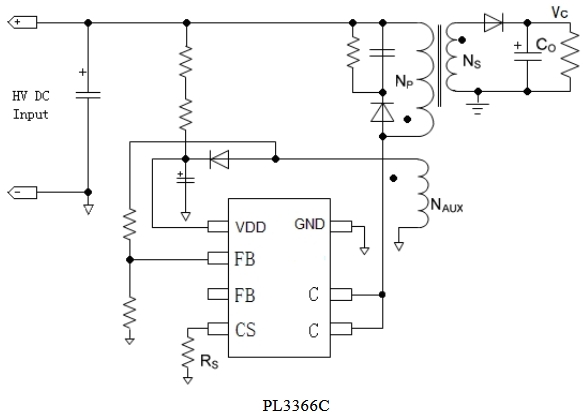 PL3366C的復(fù)合模式的應(yīng)用使芯片能夠?qū)崿F(xiàn)低靜態(tài)功耗、低音頻噪音、高效率。滿載時(shí)芯片工作在PFM模式,隨著負(fù)載降低,芯片會(huì)逐漸進(jìn)入到綠色模式,以提高整個(gè)系統(tǒng)的效率。PL3366C 同時(shí)具有多種保護(hù)功能:逐周期峰值電流檢測(cè)、VDD 欠壓/過壓保護(hù)、輸出過壓保護(hù)、輸出短路保護(hù)和過溫保護(hù)等