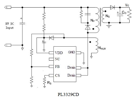 復(fù)合模式的應(yīng)用使得芯片能夠?qū)崿F(xiàn)低靜態(tài)功耗、低音頻噪音、高效率。而且高集成的功率 MOSFET 能夠降低外部 PCB的面積以及系統(tǒng)的成本。PL3329C 同時(shí)具有多種保護(hù)功能:逐周期峰值電流檢測(cè)、欠壓保護(hù)、過壓保護(hù)等。