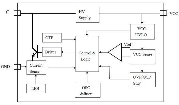 其內(nèi)部集成了高壓功率開關(guān),采用專利電壓電流控制技術(shù),無需外部電壓反饋和電流偵測電路即可實現(xiàn)精確的電壓和電流調(diào)節(jié),極大的方便客戶使用。