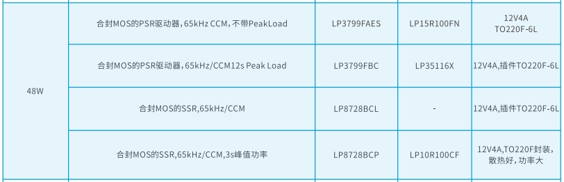 LP3799FAES:適用于65kHz連續(xù)導(dǎo)通模式(CCM)的PSR驅(qū)動器,不帶峰值負載功能。搭配LP15R100FN,提供12V4A的輸出能力。